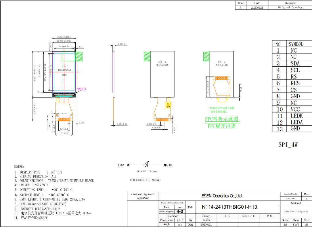 N114-2413THBIG01-H13 is a small-sized 1.14-inch IPS wide-angle TFT-LCD display module. This small-sized TFT-LCD panel has a resolution of 135×240 pixels, built-in ST7789V3 controller IC, supports 4-wire SPI interface, a supply voltage (VDD) range of 2.4V~3.3V, module brightness of 400 cd/m², and contrast of 800.